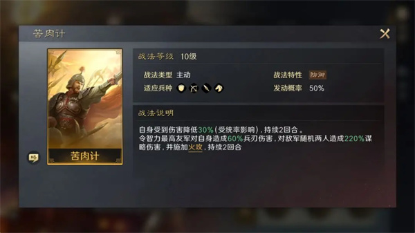 【苦肉计】主动战法,降低自身受到的伤害,智力最高的友军对自身造成兵刃伤害,对敌军造成高额谋略伤害并施加“火攻”。