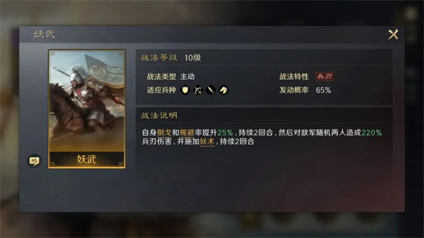 【妖武】主动战法,提升自身规避率和倒戈能力,对敌方造成伤害并施加“妖术”。