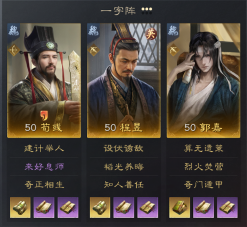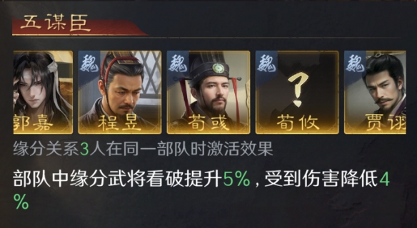 三人缘分能提升全队“看破”并减低受到的伤害,郭嘉【算无遗策】能额外提升程昱(英)自带战法【设伏诱敌】的发动率。荀彧能大幅提升全队“奇谋”和“看破”属性,全指挥战法也不怕控制,能提供持续稳定的治疗。