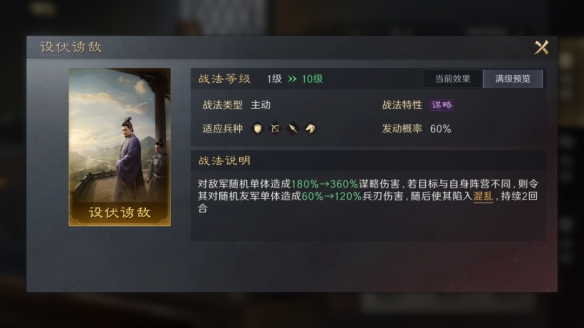 自带战法【设伏诱敌】,主动战法,对敌军随机单体造成谋略伤害,若目标与自身阵营不同,则令其对随机友军单体造成兵刃伤害,并使其陷入“混乱”。