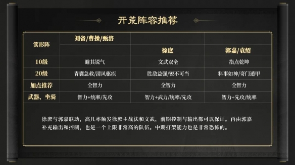 徐庶与郭嘉联动,高几率触发徐庶主战法和文武,前期控制与输出都可以保证。再由郭嘉补充输出和控制,也是一个上限非常高的队伍。中期打架能力也是非常恐怖的。
