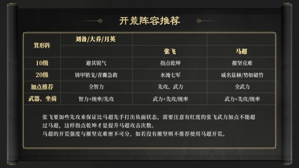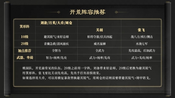 桃园队,开荒最常见的队伍。20级之前用一字阵,刘备带来好息师,20级后更换为避其锐气用箕形阵。张飞要比关羽先攻高,先出手打出畏惧效果。如果选择用大乔,可以用横征暴敛替换避其锐气。用周仓的话则需要带避其锐气+铸甲销戈。