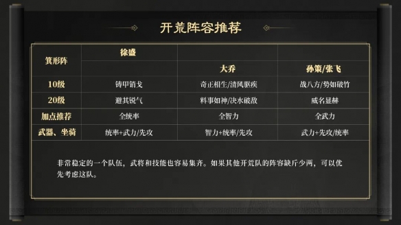 非常稳定的一个队伍,武将和技能也容易集齐。如果其他开荒队的阵容缺斤少两,S2赛季可以优先考虑这队。