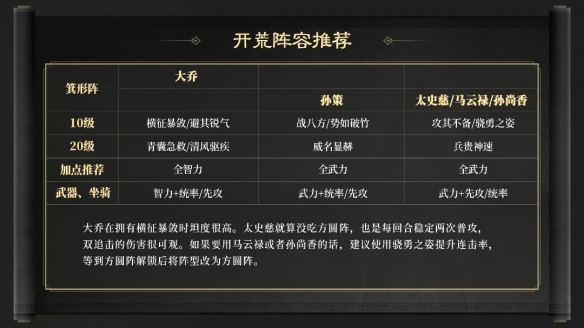 大乔在拥有横征暴敛时坦度很高。太史慈就算没吃方圆阵,也是每回合稳定两次普攻,双追击的伤害很可观。如果要用马云禄或者孙尚香的话,建议使用骁勇之姿提升连击率等到方圆阵解锁后将阵型改为方圆阵。