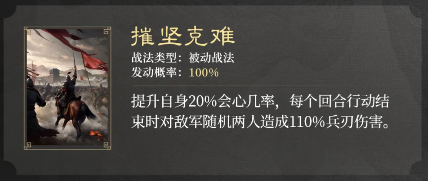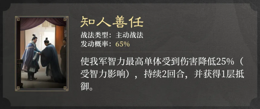 自带主动战法发动率提升6%(受智力影响),每个回合提升自身7%谋略伤害,可叠加,持续到战斗结束。