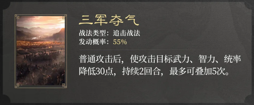普通攻击后,使攻击目标武力、智力、统率降低30点,持续2回合,最多可叠加5次。