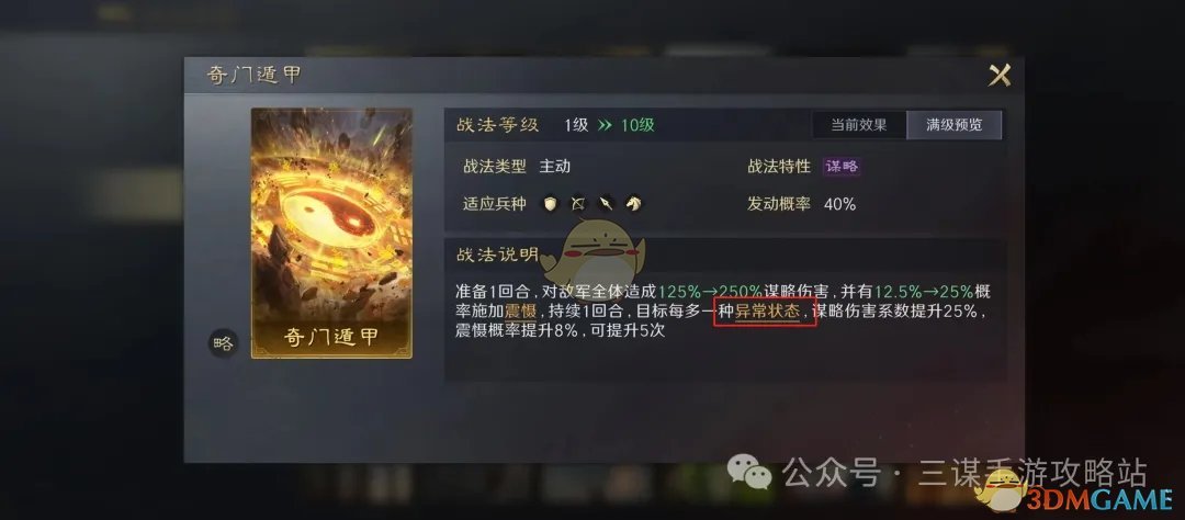 关于奇门遁甲/经天纬地:建议于吉带经天纬地,张角带奇门遁甲,因为这队异常状态很多,奇门遁甲最终输出大概率超过经天纬地,而且于吉需要先手打出经天纬地帮助奇门遁甲打输出和震慑。
