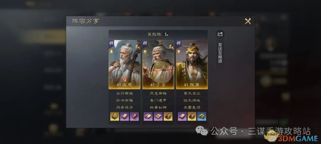 队伍优点:现在的三仙,没有特别怕的队伍,脸好打一切,脸黑也能压制司马盾、陆逊、虎卫等中速、慢速体系,实战效果属实不错。