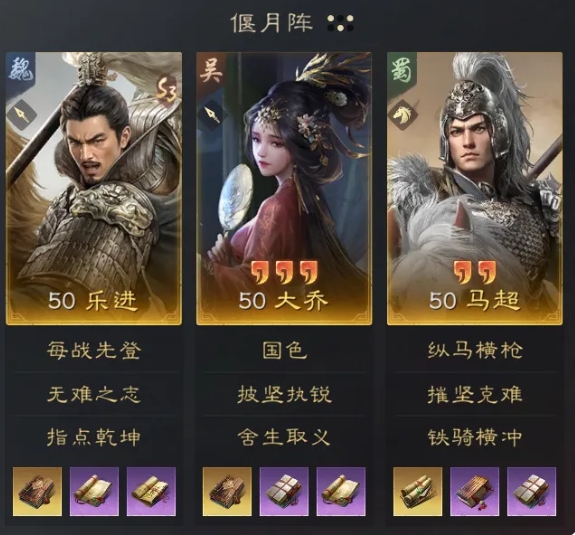 此队相比于乐进吕布来说一是有摧坚克难的稳定触发;二是乐进和马超通过偃月阵站前排可以充分发挥乐进的每站先登的效果;另外有了大乔的治疗后也有一定的恢复能力,对于连穿是有帮助的。