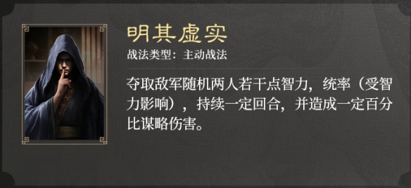 夺取敌军随机两人若干点智力,统率(受智力影响),持续一定回合,并造成一定百分比谋略伤害。