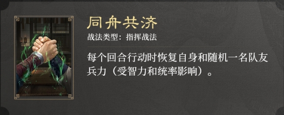 每个回合行动时恢复自身和随机一名队友兵力(受智力和统率影响)