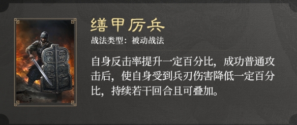 自身反击率提升一定百分比,成功普通攻击后,使自身收到兵刃伤害降低一定百分比,持续若干回合且可叠加。