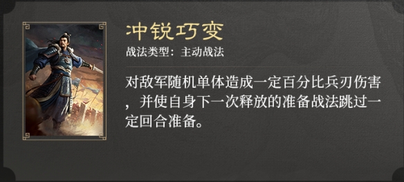 对敌军随机单体造成一定百分比兵刃伤害,并使自身下一次释放的准备战法跳过一定回合准备。