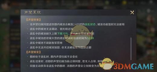 郡内郡府施政结束,声望归属确定后,后续郡内城池被非声望所属同盟所攻下时,会进入“战乱”状态,持续24小时。战乱期间城池的部分功能无法使用。