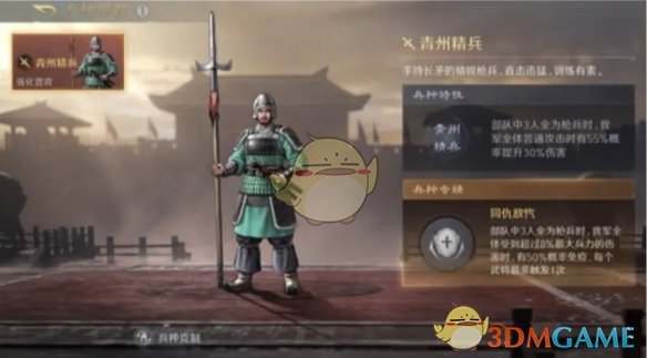 兵种特性:部队中3人全为枪兵时,我军全体普通攻击时有55%概率提升30%伤害。