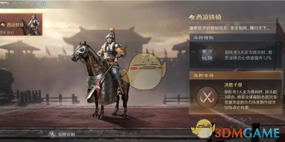 兵种解读:西凉铁骑适配的武将为与爆发兵刃伤害挂钩的武将,且最好是搭配单段兵刃伤害,这样搭配兵种专精提供的会心摄率可以在战斗前期造成高数会心伤害。