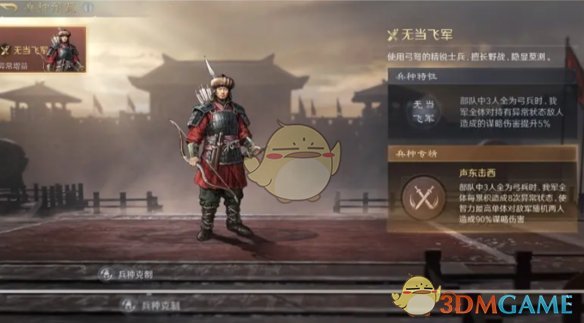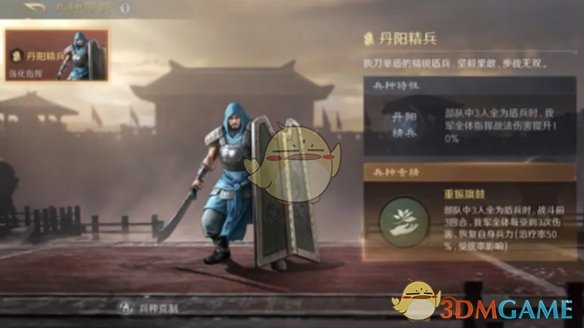 兵种解读:丹阳精兵适配的武将为指挥类战法武将,且最好是统率较高的武将,这样既可以获得额外塔伤,也能完美过渡战斗内的前期(即前3回合)。