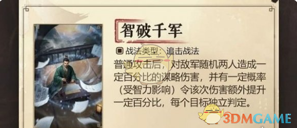 普通攻击后,对敌军随机两人造成一定百分比的谋略伤害,并有一定概率(受智力影响)令该次伤害额外提升一定百分比,每个目标独立判定。
