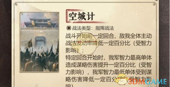 特定回合开始时,我军智力最高单体造成谋略伤害提升一定百分比(受智力影响),我军智力最低单体受到谋略伤害降低一定百分比(受智力影响)。