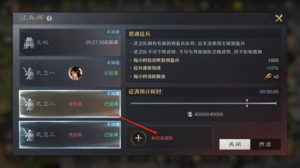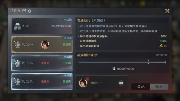 武卫队是征兵所中独立的预备兵队列,任命为武卫队的部队可使用对应的专属预备兵,每个武卫队会独立计算征兵速度、粮食消耗。