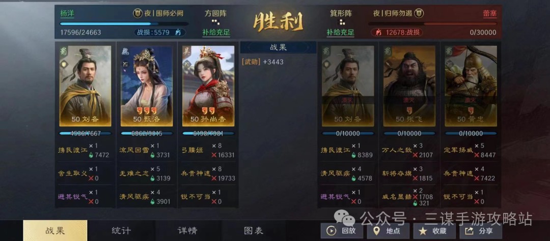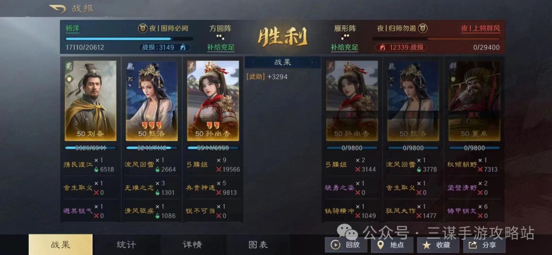 阵型选择:方圆阵,刘备、甄洛前排抗伤,孙尚香后排吃连击率加成。