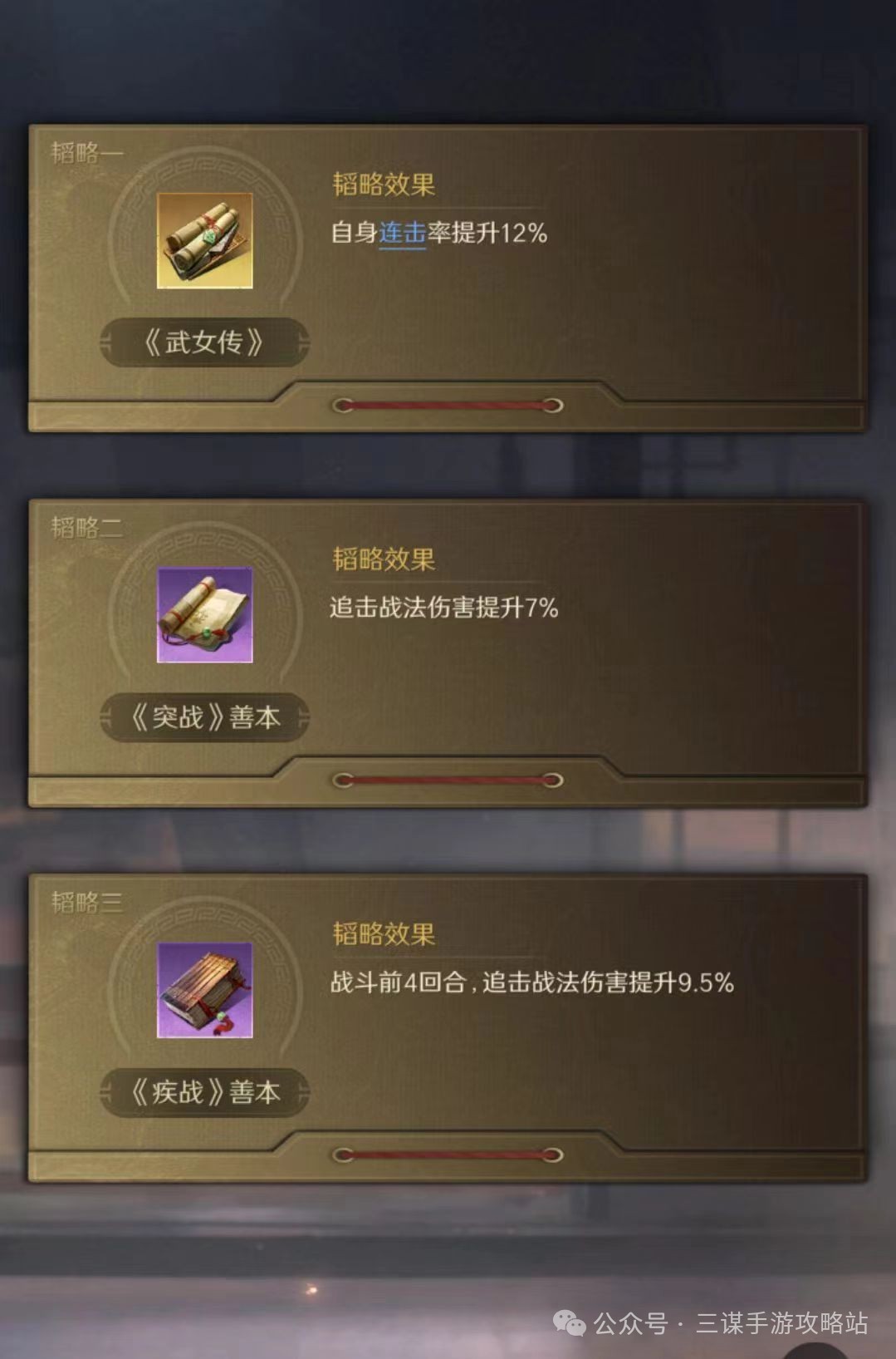 兵书方面:三位武将都需要金书,刘备金书选择国志汉书,甄洛金书选择相怜洛神赋下。貂蝉刘备、甄洛其他兵书建议选择先勇、互势、兵令等。孙尚香选择增伤类兵书即可。