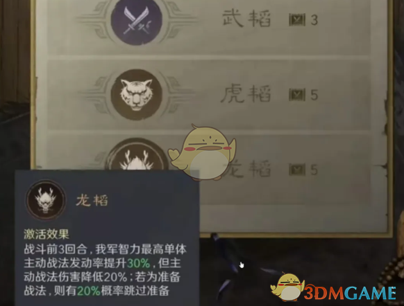 4、龙韬主要是给张角准备的,叠加后可以让张角前三回合战法发动率和跳过准备回合的概率均达到90%,进而可以打出非常恐怖的控制,还能辅助张宁输出。