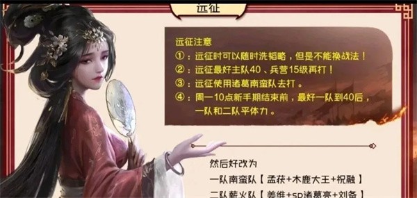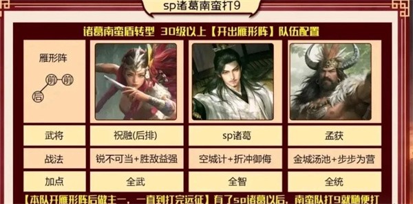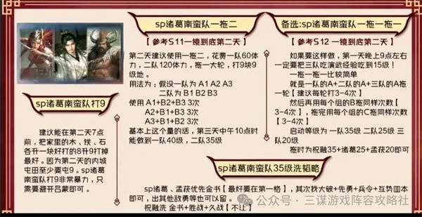 6、sp诸葛南蛮队打9级地及后续:sp诸葛加入后南蛮队强度提升,还可用于一拖二/一拖三,35级后可洗战法,远征也用该队,新手期结束前尽量让一队到40级。