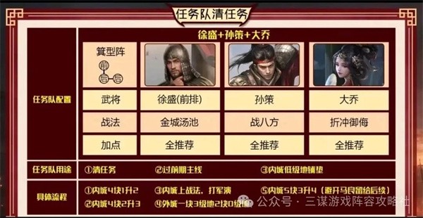 1、任务队清任务:用徐盛、孙策、大乔组成的“孙大圣”队,按内城升地、打军演、外城打地的流程清任务,避开马良队留给后续队伍。