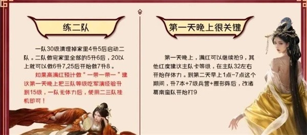 7、练二队:一队30级满建筑4级后启动二队,二队满建筑5级后可带兵打高级地,主队可靠经验书升级,一队没体力后二队挂机。