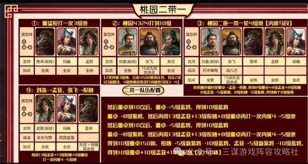 2、桃园二带一:董卓、孟获先打3级地,再上刘备、张飞、关羽的桃园队,升级后通过置换武将,最终得到10级左右的董卓、孟获、祝融,为南蛮队铺路。