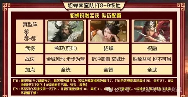 5、貂蝉南蛮队打8 - 9级地:有两种配法,可孟获前排或貂蝉前排,8级地优先打张飞,9级地满红30级、高红31级可尝试,优先打张飞、徐晃,避开虞姬。