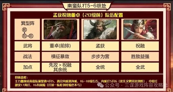 3、南蛮队打5 - 6级地:董卓(横征暴敛)、孟获(步步为营)、祝融(胜敌益强)组队,16 - 17级左右可打内城5 - 6级地,优先选文聘、刘晔,红度低可升一级再尝试。