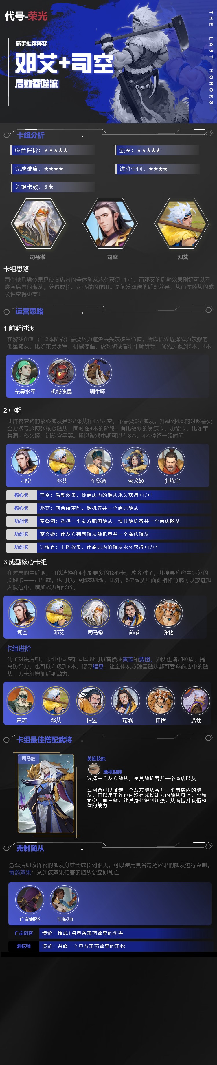 此阵容套路的核心随从是3星邓艾和4星司空,不需要6星随从,升级到4本的时候需要全力搜寻这两张核心随从,同时在4本的阶段,有比较多的资源卡、功能卡,比如军祭酒、蔡文姬、训练官等等。所以游戏中期可以在3本、4本停留一段时间