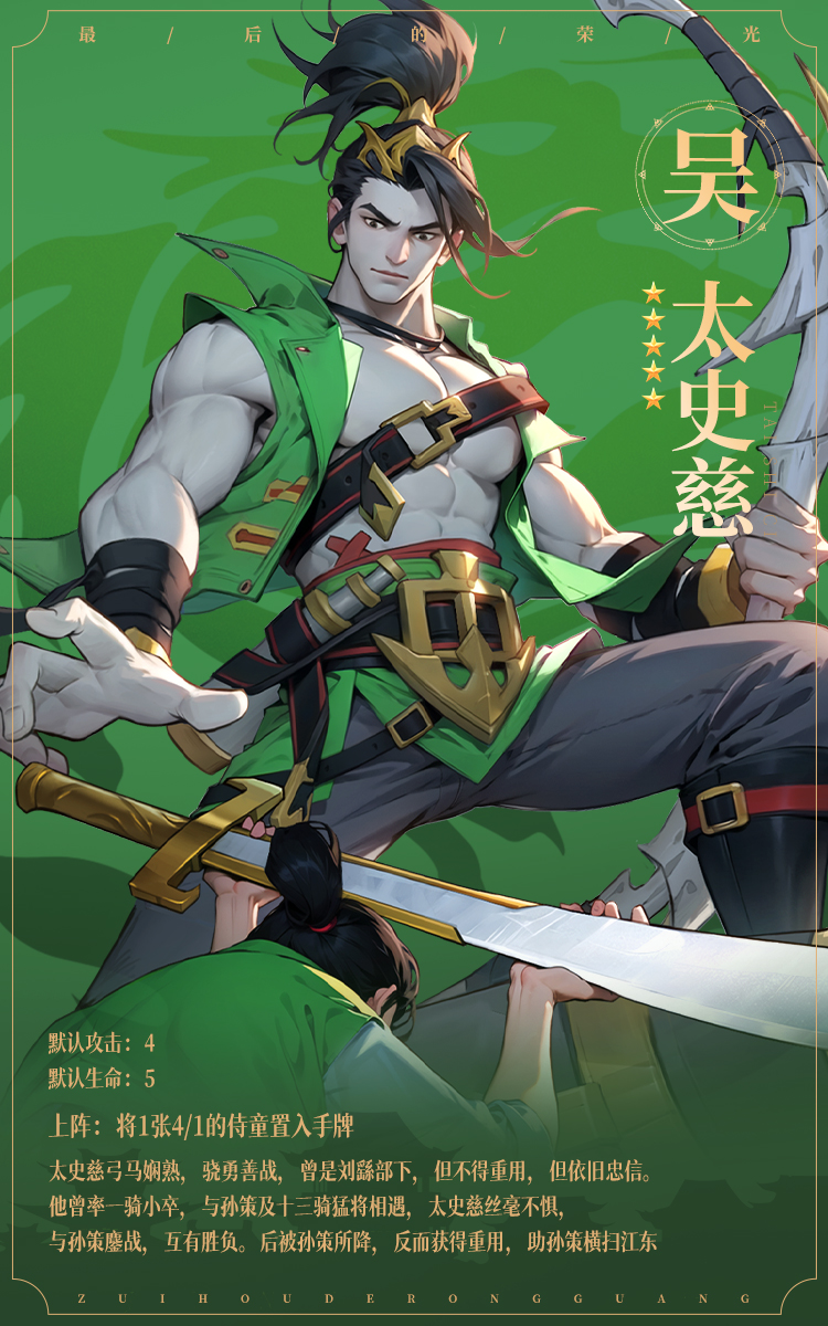 太史慈,吴阵营,上阵获得1张属性为4/1的侍童手牌。