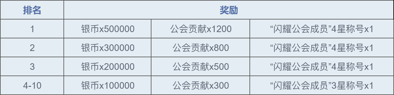 2、活动时间内按照公会评分进行排名,活动结束后公会排名前10名的公会成员可领取“闪耀公会成员”称号。
