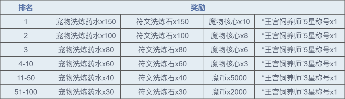 活动结束后前100名可获得宠物洗炼药水、符文洗炼石、魔物核心、称号等排名奖励。