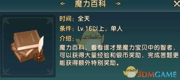 魔力百科属于一个单人副本,玩家需要通过答题来获取奖励,在16级以上就可以解锁,全天都能参与,每天最多可以参与10次。