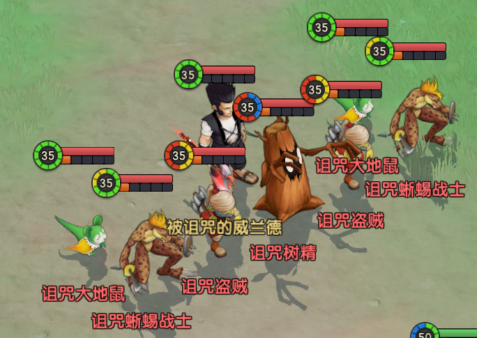 魔物介绍:前排两侧依次为蜥蜴战士、盗贼、中间树精,后排从左依次为大地鼠、威兰德、大地鼠。 整体构成为前排防御向宠物,后排群攻输出。