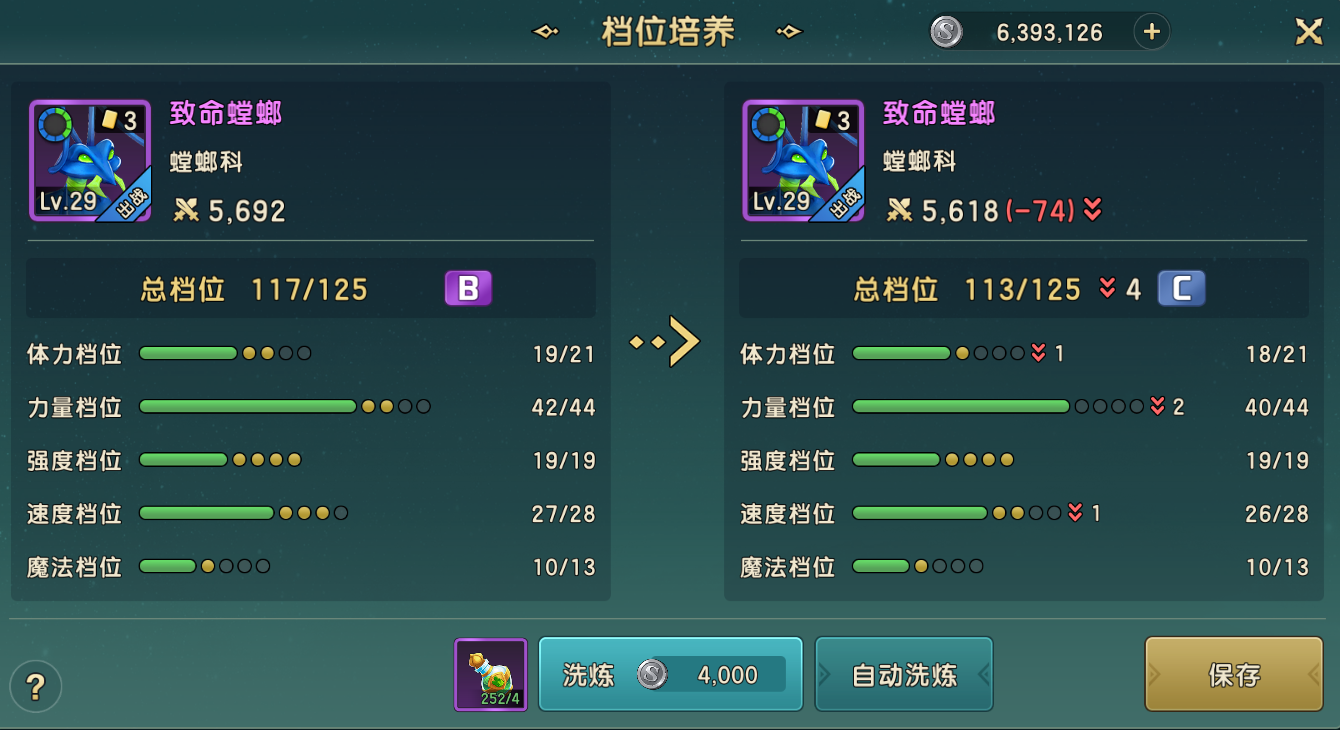 同理的,在进行洗炼时,也不必追求A级或者更高总档位洗炼,b级相对较高即可(以125总档位为例,大约在115以上即可,当然如果能最低成本洗出A级是最好的)。
