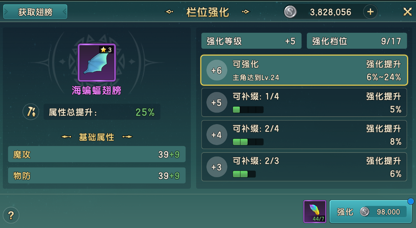 ④翅膀强化在获取翅膀后,系统会提示进行翅膀强化,但在这里必须提醒各位冒险者,由于翅膀强化会消耗大量银币和羽毛,建议至少在目前阶段中不要投入太多资源进入,最多将强化档位全开了就行,不要再投入资源将其补缀到满。