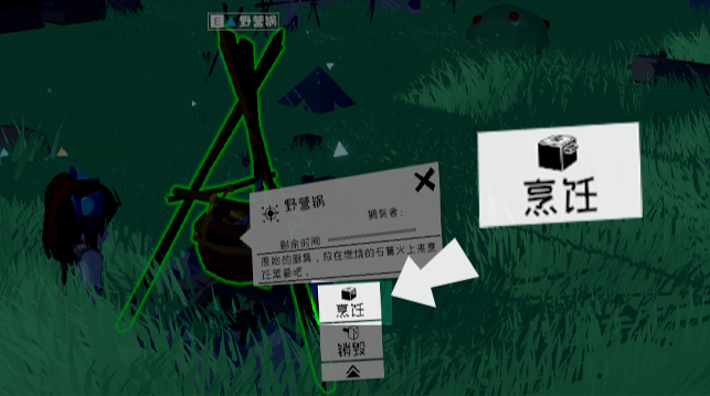 3、使用锅烹饪时,必须保证篝火/灶台处于点燃状态。