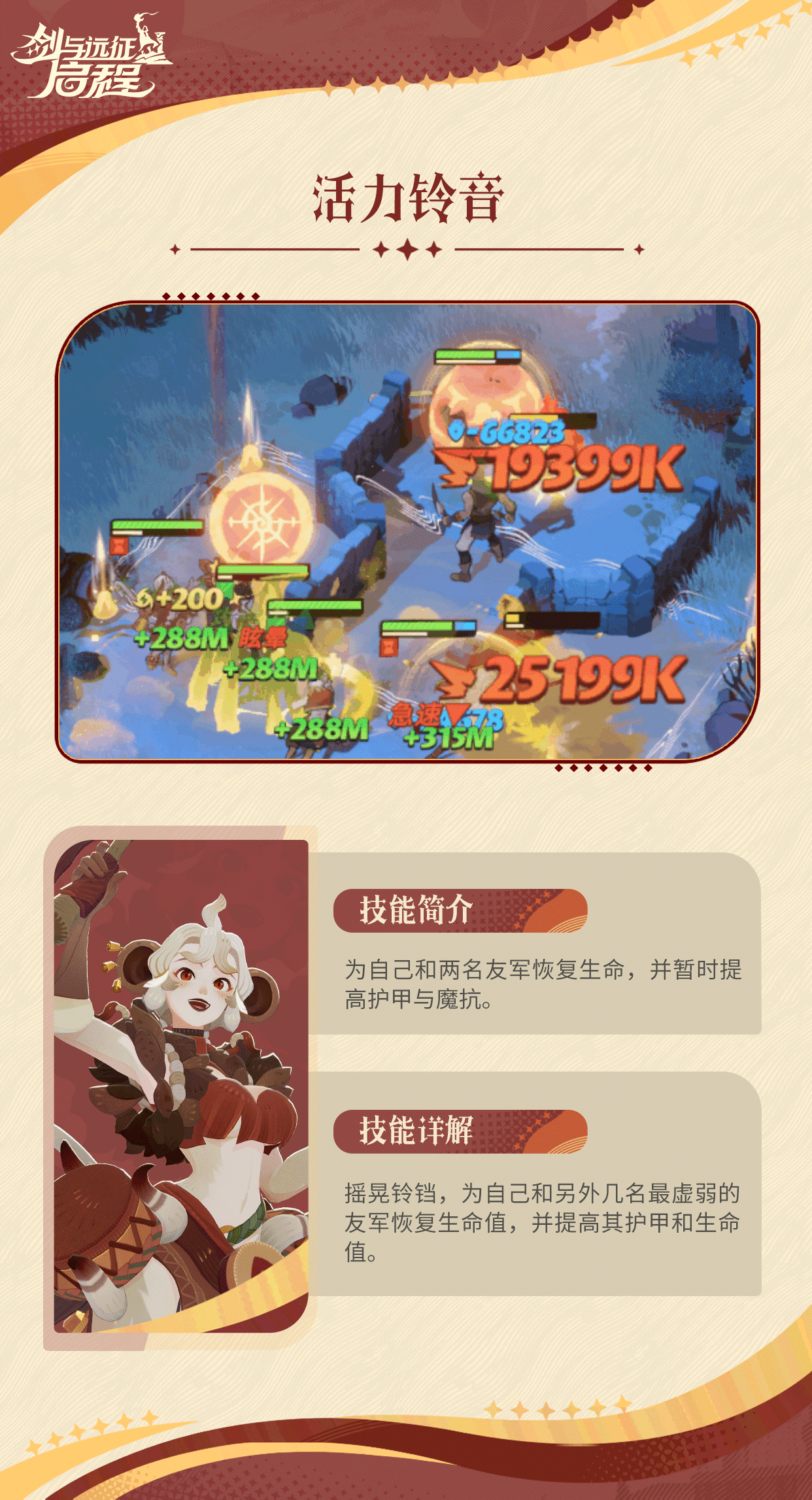 效果:摇晃铃铛,为自己和另外2名最虚弱的友军恢复生命值,并使其护甲与魔抗提高,持续一段时间。