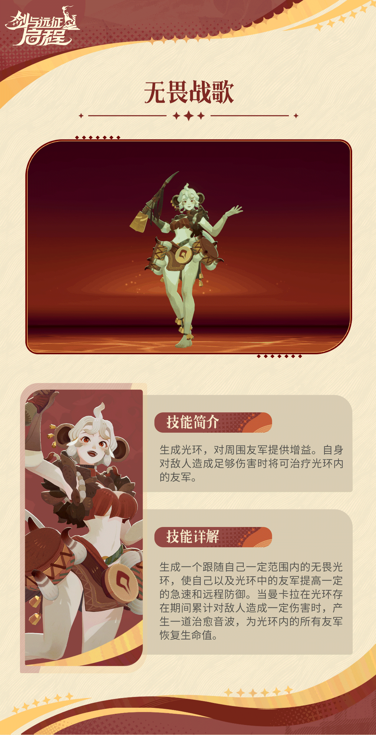 效果:生成一个跟随自己的半径2格的无畏光环,使其中的友军提高40点急速和10点远程防御,自己额外提升30点急速和10点远程防御。当曼卡拉在光环存在期间累计对敌人造成相当于自身初始攻击力300%的伤害时,产生一道治愈音波,为光环内的所有友军恢复生命值。