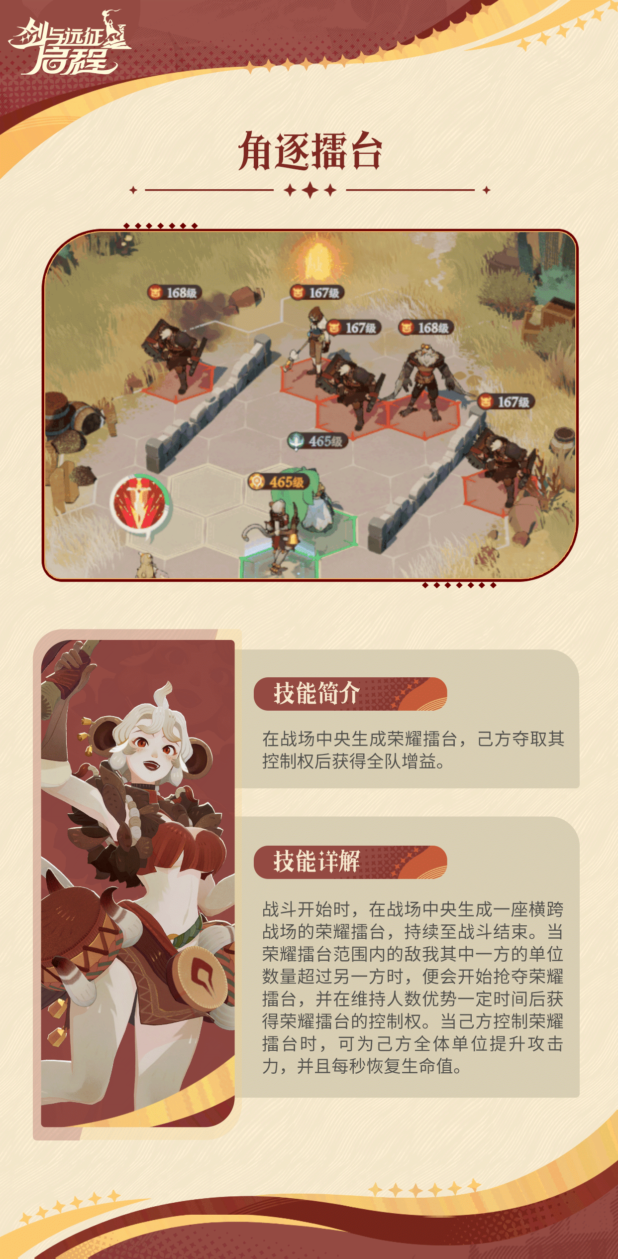 效果:战斗开始时,在战场中央生成一座横跨战场的荣耀擂台,持续至战斗结束。当荣耀擂台范围内的敌我其中一方的单位数量超过另一方时,便会开始抢夺荣耀擂台,并在维持人数优势3秒后获得荣耀擂台的控制权。当己方控制荣耀擂台时,己方全体单位提升攻击力,并且每秒恢复生命值。