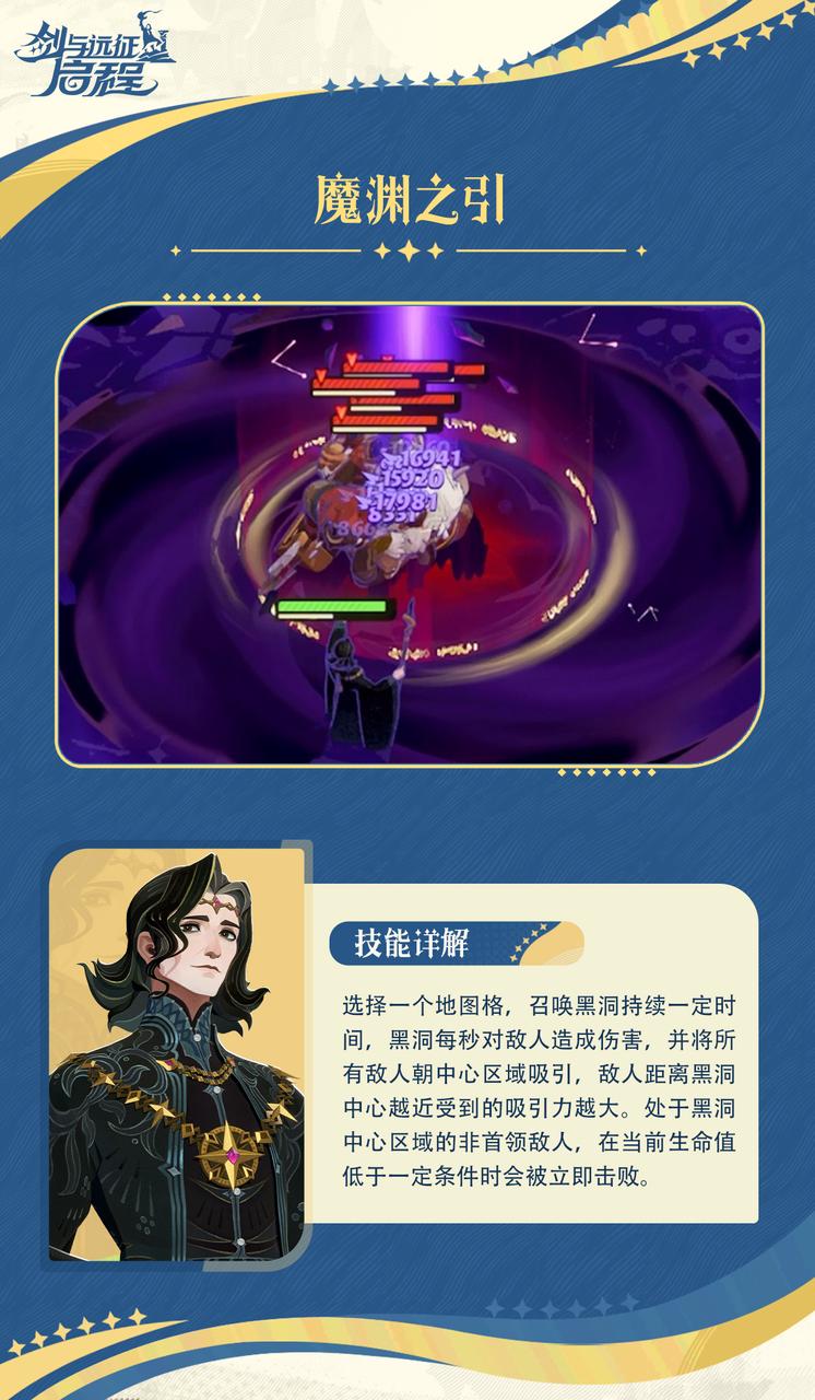 选择一个地图格,召唤黑洞持续一定时间,黑洞每秒对敌人造成伤害,并将所有敌人朝中心区域吸引,敌人距离黑洞中心越近受到的吸引力越大。处于黑洞中心区域的非首领敌人,在当前生命值低于一定条件时会被立即击败。