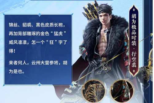 胡为的极品时装外观上是黑色的长袍搭配上衣的貂,看起来是很威风的还有后背的猛虎,显得整个看起来威风凛凛。