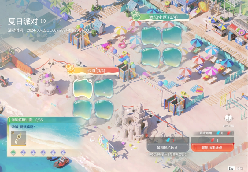 2、在活动界面中,消耗小雪糕可随机解锁一个海滨地点,解锁完一个区域的所有地点,可获得区域对应的奖励,并解锁一张夏日派对漫画,活动总计有6个区域等待解锁。