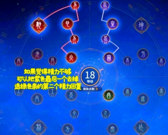 2、精力不足时,可移除紫色最后一个天赋,根据情况选择绿色条的第二个精力回复。