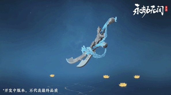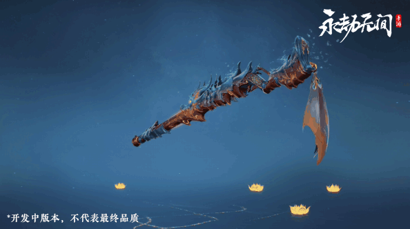 银刃为主,刀柄周围环绕着绚丽的图腾,海浪般的盈蓝之光萦绕其上。握持时仿佛海浪轻吟,涛声在耳畔低回。
